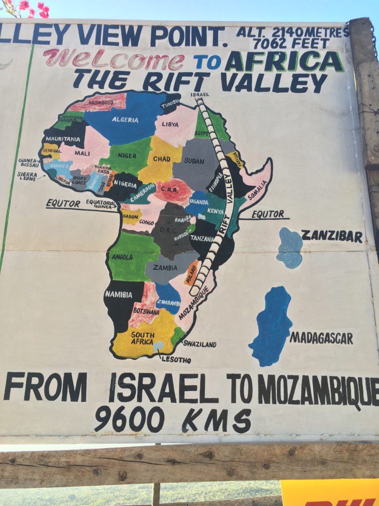 The roadside stalls, dukas, also sport hand-painted signs. Some obvious: ‘Pub’. ‘Internet’. Some less so: ‘Apple God Kiosk’. ‘Tomato Butchery’. We arrive at the top of the Escarpment and there is the Rift Valley, stretching all the way to Israel. We descend the road that’s all narrow tight bends and see a car overturned down the bank. Two weeks later, a tanker carrying chemical gas skids out of control on this road and crashes. The fireball kills thirty people.
